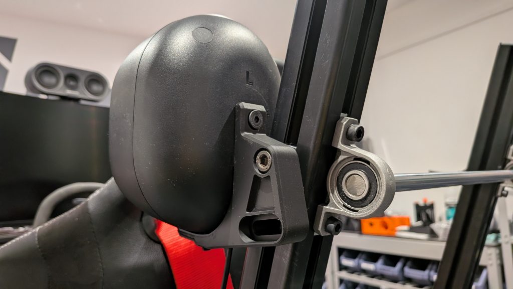 J’ai donc développé spécialement des impressions 3D que vous pouvez télécharger sur Cults. Cela m’a pris beaucoup de temps à faire pour que ce soit propre, d’autant qu’aucune surface n’est plate, mais c’est maintenant solidement fixé. Au final j’ai aussi développé une solution de montage pour les enceintes arrières car je ne trouvais pas mon compte avec les fixations vendues en ligne. En effet, avec le simulateur de mouvement, les enceintes ne peuvent pas tenir si elles sont fixées simplement au bout d’un bras.